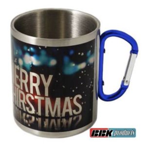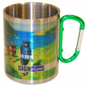 Fém karabineres termo bögre metál zöld vagy kék füllel egy hasznos és praktikus egyedi ajándéktárgy a palást felületére nyomtatott grafikával!